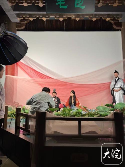 剧中,夫差梦见被狗妖袭击,如此玄幻的一幕,其实是在包公故里文化园的幕墙放映厅内拍摄的。“剧组利用纱帐和荷花布置出充满玄幻感的环境,还设计了一场投影壁上的梦境戏。这个狗头套橡胶味很重,剪辑师鹿燕林主动请缨扮演狗妖,连拍多条,超级敬业。”孙晨说。