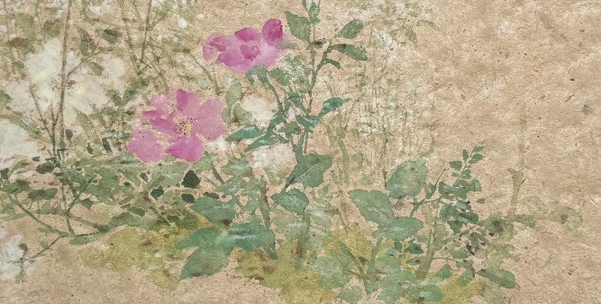 调 “仙境月季” 的颜色花了不少功夫。万娟以曙红为底,加了些钛白调和,胭脂加多了会偏紫,加少了又太艳,最后调出的粉紫色,正好和眼前被午后阳光照亮的花瓣对上了。花瓣颜色厚一点显得饱满;背面花瓣就蘸稀释的颜料,露出点纸色,透着通透感;花瓣翻转的地方,用清水笔轻轻晕一下,转折就自然得像真的在光影里扭转。枝干趁墨色没干时蘸深赭石画刺,让尖锐的刺和柔媚的花瓣形成对比。