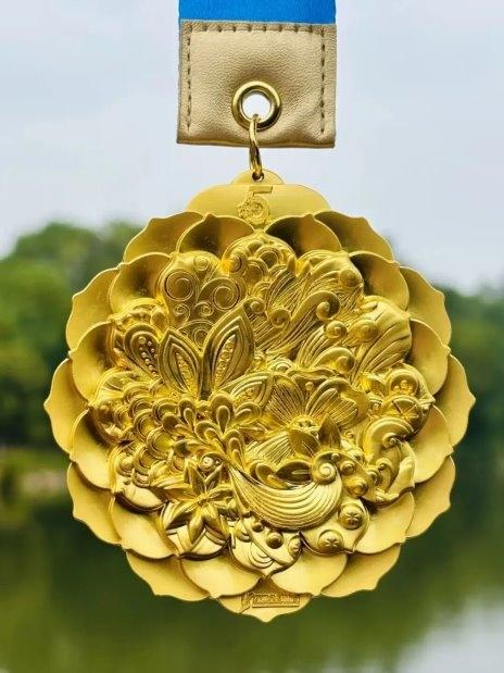 完赛奖牌呈亮金色,以“莲动,塔影、逐梦”为三重设计思路,将黄冈的“自然生态标识”(荷花)、“文化地标”(青云塔)与马拉松的“坚持”“胜利”“逐梦”精神深度融合,形成“外显自然之美、内藏文化之魂”的设计逻辑,打造“有故事、有温度、有辨识度”的赛事纪念物。