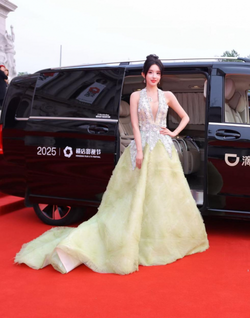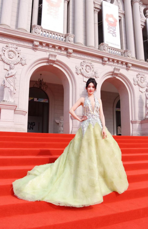 此次亮相红毯仪式,何沐蓉的造型也可圈可点,她一袭浅绿与银白交织的挂脖深V礼服惊艳亮相,裙身如春日清泉泛起粼光,蓬松拖尾似云雾轻扬,勾勒出曼妙身姿,与会场的古典建筑相得益彰,也凸显着她作为“青年演员扶持计划”的演员,这一路走过的坚持和如今的蜕变和成长。