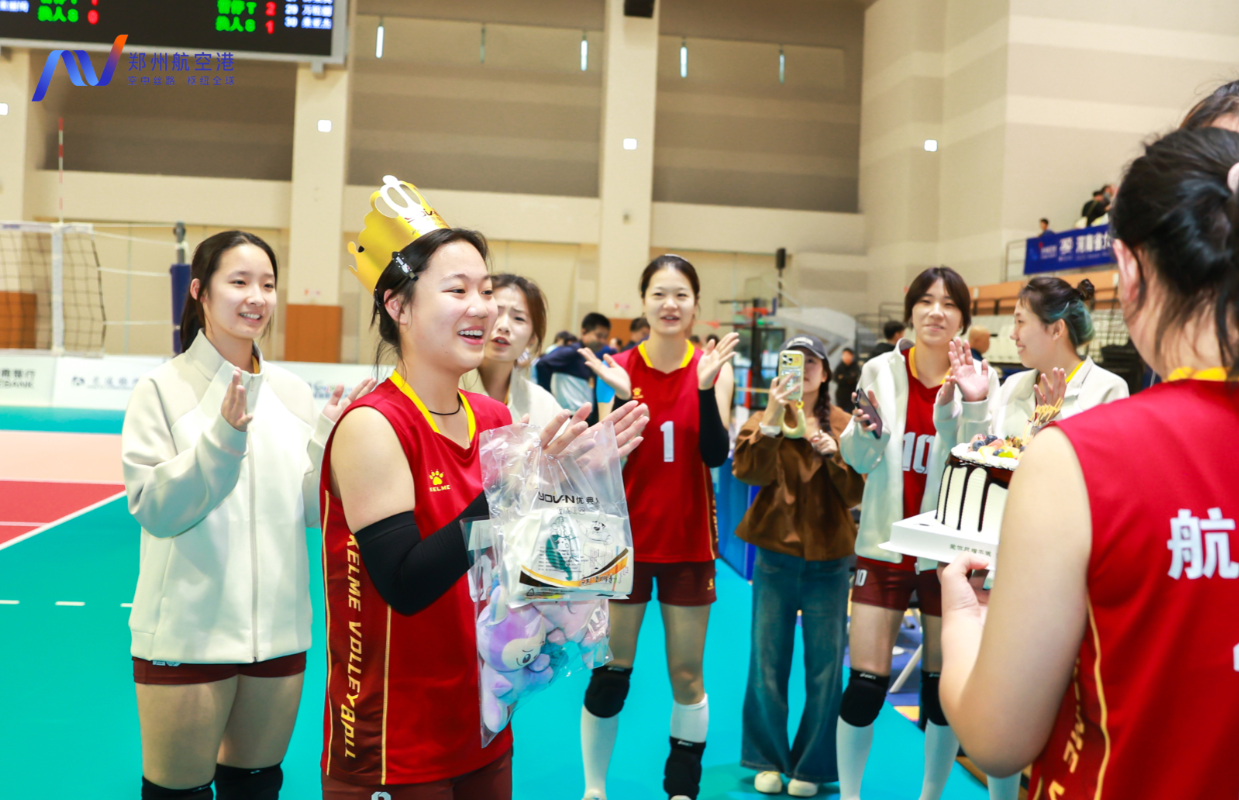 比赛之余还有一件让人意想不到的事情:“祝你生日快乐!”在全场的祝福声中,本场赛事迎来了最后一个惊喜。航空港区队女排队员刘佳童迎来了17岁生日,“完全不知道,真的很感动!感谢航空港区的工作人员为我准备的惊喜。”这一刻,赛场瞬间被爱意包围。