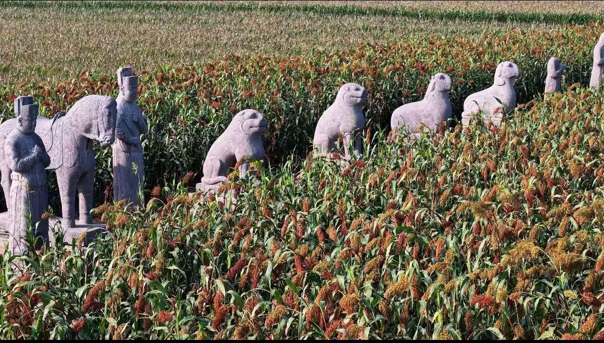 10月21日,风轻云淡,天朗气清,巩义市芝田镇八陵村外的永泰陵来了不少游客。吸引他们的,是神道两侧栽种的一片高粱。高粱穗子低垂、殷红色彩,微风拂过、沙沙作响。两排石像生,站在高粱田内,相对无言,意境深沉。