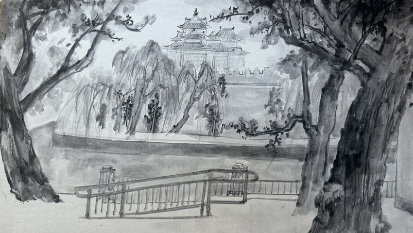 构图上,这幅西华门之景延续了首幅的横幅框架,却在细节处藏着新意。近景以两棵古柏为锚点:右侧截取树干中段,上下边界留白,凸显枝干的虬曲;左侧则露出部分树根,让 “扎进土里” 的扎实感与右侧形成对比。这种 “不完整却互补” 的布局,是陈威对 “自然取舍” 的再实践,正如他在地坛写生时截取古柏下半段那般,此次不追求西华门的全景,而是让近景古柏的苍劲与远景建筑的庄重形成 “顾盼关系”,中间以河面为过渡,让空间纵深感在笔墨间自然延伸。他先以重墨勾勒近景古柏的主干,笔腰用力皴擦出树皮纹理,再逐步推进至中景河面,最后用淡墨轻描西华门的轮廓,整个过程从 “实” 到 “虚”,恰如视线从眼前古柏望向远处建筑的自然轨迹。
