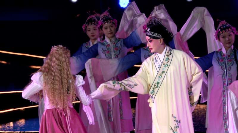 第三篇章“美美与共赋长情”着力呈现东西方文化的情感共鸣。由昆曲名家柯军与英国导演里昂·鲁宾(Leon Rubin)联合创排的戏剧《汤莎会》,让《牡丹亭》和《罗密欧与朱丽叶》同台相遇,展现东方“至情”与西方“挚爱”的精神契合。晚会尾声,中英歌手与台上演员共同唱响主题曲《我在牡丹亭等你》。