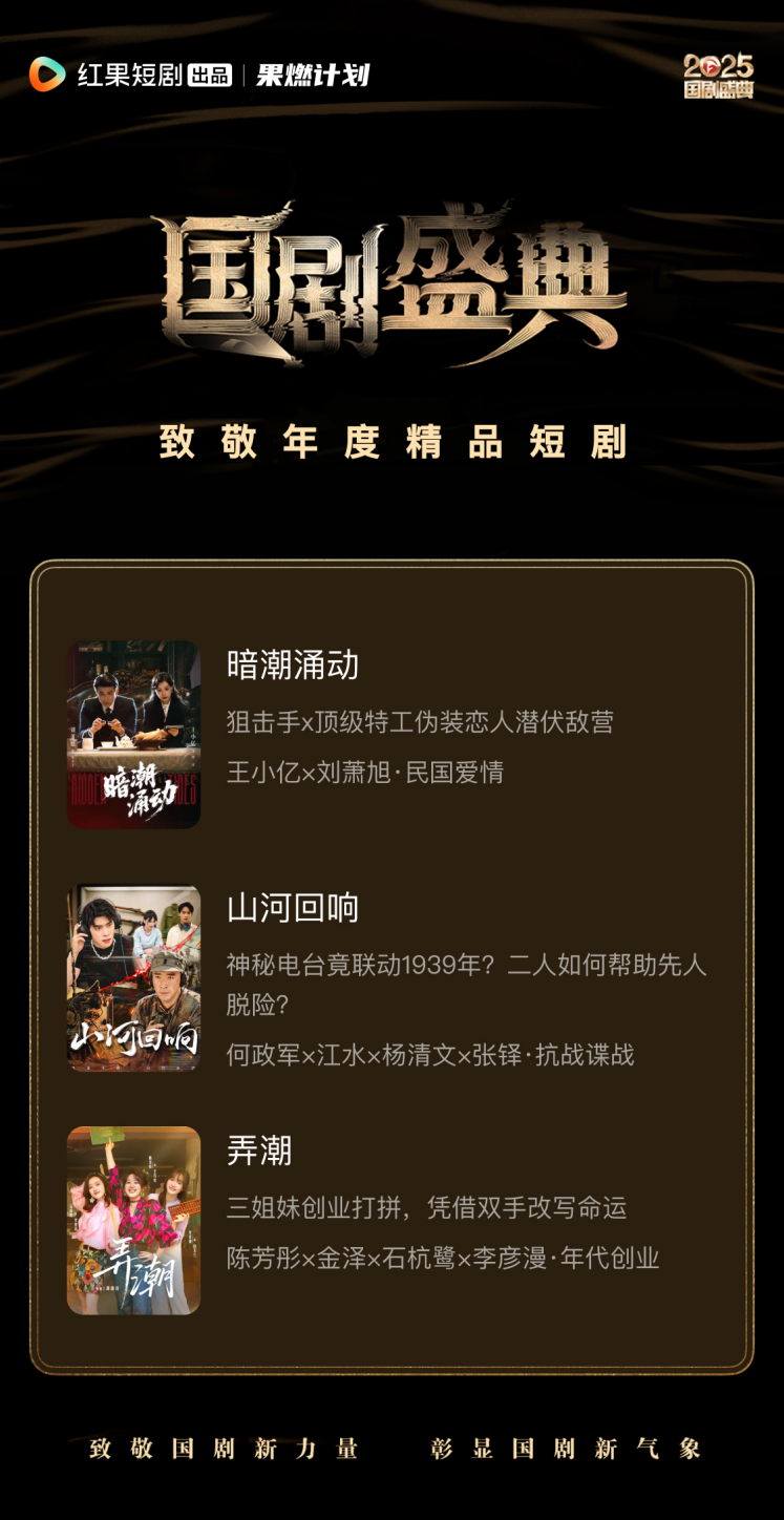 盛典紧扣“破局而立·剧力向新”的年度主题,回顾了一众优秀国剧人与时代共振、与人民共情的创作足迹,展现了行业在“破局”中探索、在“向新”中成长的蓬勃气象。活动还特别设置环节,致敬蓬勃发展的精品微短剧。其中,红果短剧“果燃计划”推出的《山河回响》《暗潮涌动》《弄潮》以紧凑叙事传递时代强音,凭借独特美学拓宽短剧内容边界,获评“致敬年度精品短剧”。