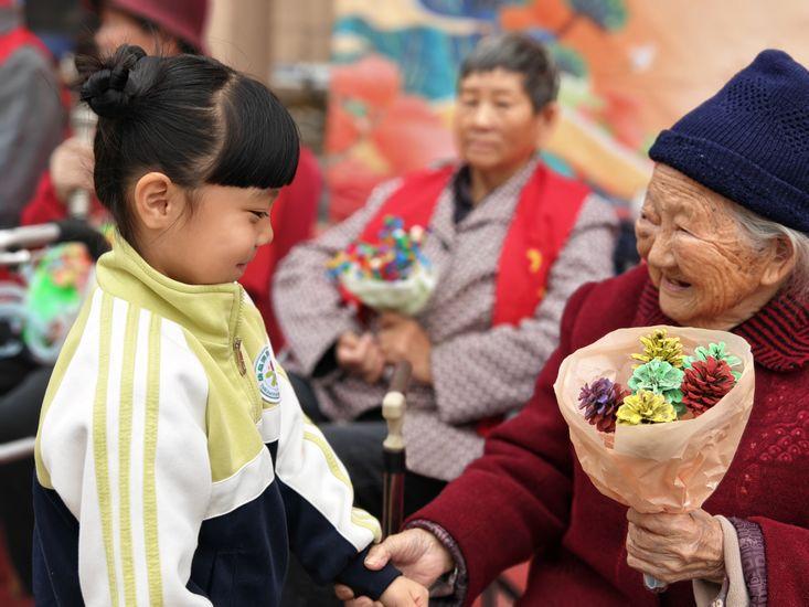 活动现场温情满满,在主持人对重阳节习俗与活动意义的介绍中,这场爱心之旅正式开启。孩子们手捧提前精心制作的手工花束,依次送到爷爷奶奶手中,一句句“爷爷奶奶节日快乐”的稚嫩话语,如同暖阳般照亮老人们的脸庞,瞬间拉近了彼此的距离。