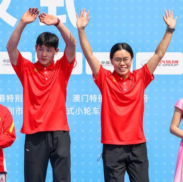 10月25日,河北选手张贺强(左)与教练员闫伟娜站在领奖台上。