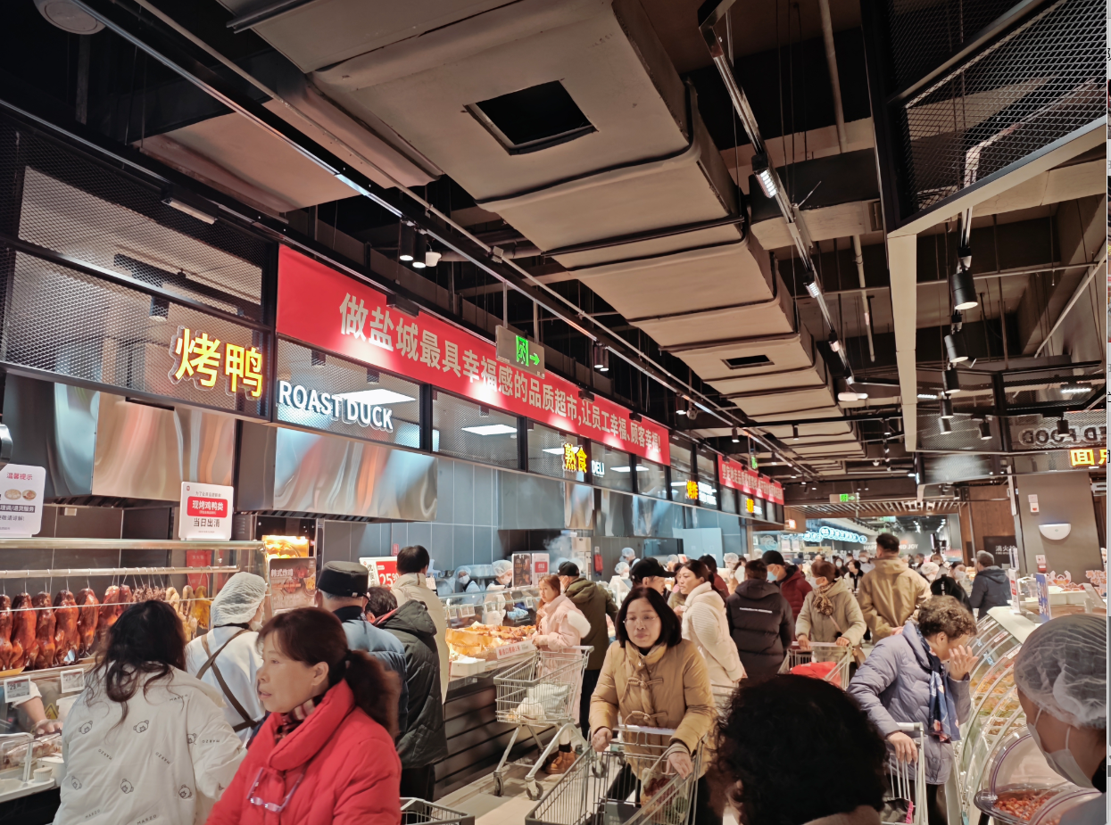 调整后商品结构达到胖东来体系的80%,进口商品占比提升至11%,烘焙、熟食等鲜食比例从5%大幅增至23%。生鲜区域全面升级,引入高山、有机、绿色及定向种植等特色商品。熟食区汇聚东来同款韩式炸鸡、双汇甜肠、久多肉多麻辣猪蹄等爆款,同时引入当地特色烤鸭、南京盐水鸭、六合猪头肉及桂花糕。