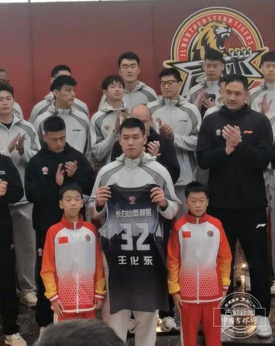 在新球衣授予环节,吉林东北虎小虎队的队员们为曾繁日、赵率舟、刘雁宇、段立谦、杨腾飞、王化东、马聪以及外援摩尔、威尔逊、阿普森等新成员呈递上了东北虎战袍。