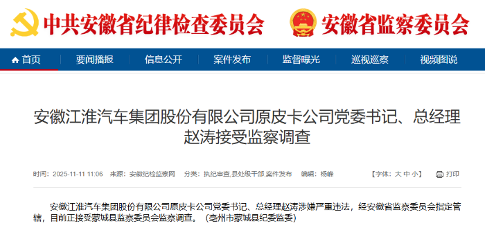 大皖新闻讯 11月11日,亳州市纪委监委发布公告。安徽江淮汽车集团股份有限公司原皮卡公司党委书记、总经理赵涛涉嫌严重违法,经安徽省监察委员会指定管辖,目前正接受蒙城县监察委员会监察调查。