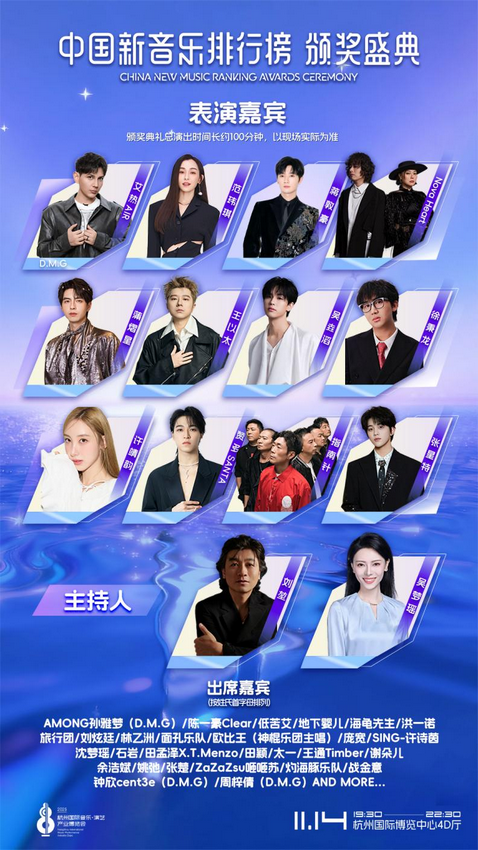 2025中国新音乐排行榜颁奖盛典将于11月14日晚19:30在杭州国际博览中心4D厅举办。作为MUSIC P.I.E-2025杭州国际音乐·演艺产业国际博览会的核心重磅环节之一,备受业界瞩目。中国新音乐排行榜,创立于2023年,是由国家音乐产业基地联盟主办的华语音乐类权威榜单,是“中国音乐出海计划”中重要的组成部分。张靓颖、王铮亮、谢天笑、回春丹、娄艺潇、吉克隽逸、方文山等众多明星、乐队、音乐人曾在往届获此殊荣。从初露锋芒到声名远播,中国新音乐排行榜以专业、公正、权威备受行业已成为中国音乐产业最具影响力的风向标。本届中国新音乐排行榜颁奖盛典的重磅回归,将为华语乐坛献上一场年度荣誉盛宴。