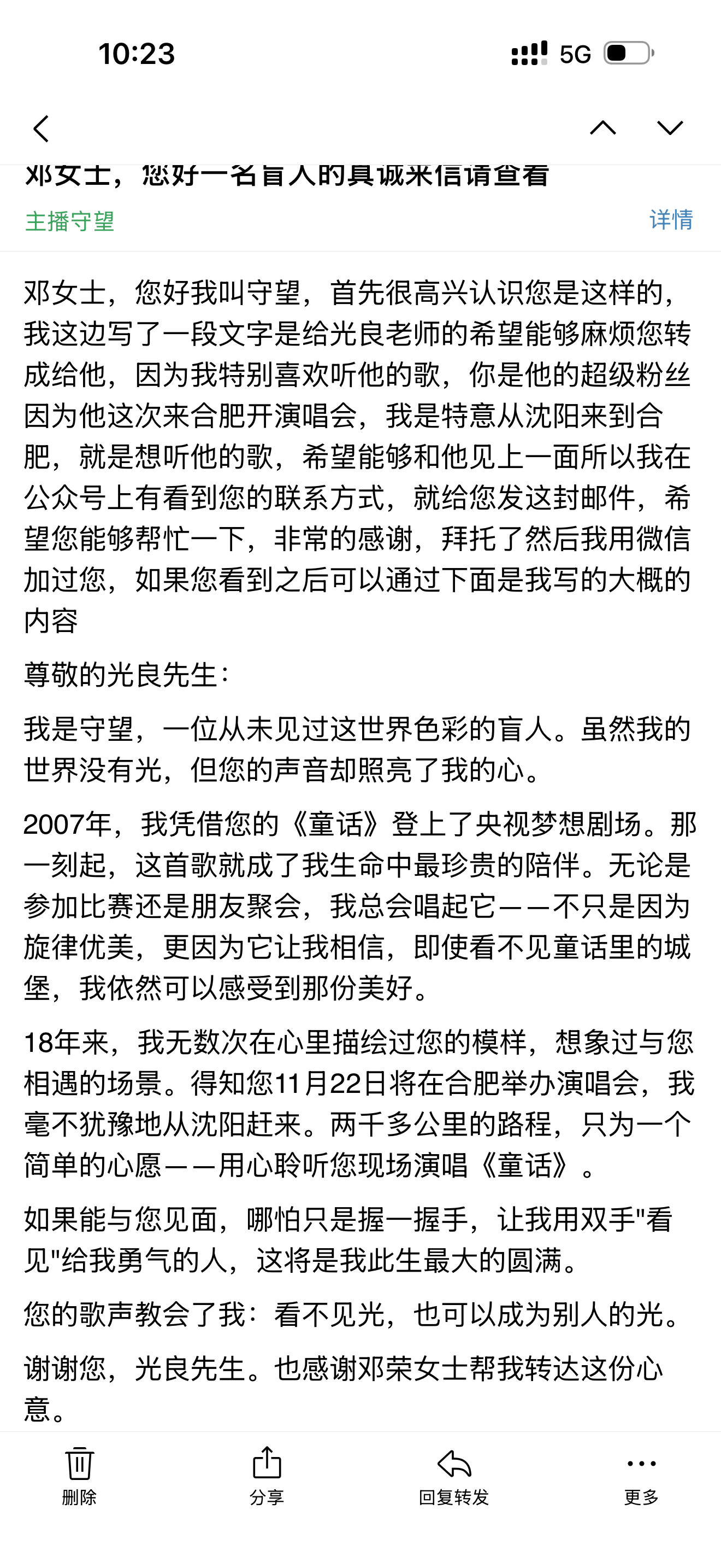 守望说,光良出道30年,他喜欢《童话》,也喜欢了18年。临近合肥站演唱会,光良的经纪人邓女士收到了守望写的一封邮件:“我是守望,一位从未见过这世界色彩的盲人。虽然我的世界没有光,但您的声音却照亮了我的心。”