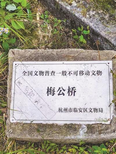 读罢简短文字,虽知道“桥”和“电”是梅兰芳所行的善事,但究其缘由,则一无所知。忽见桥头有块1米多高、50多厘米宽、刻有“重修”二字的石碑,内中文字已漫漶不清,几成“无字碑”。但在模糊的碑文中,我用水一泼,却隐隐约约地显露出“陆佰”两字。于是我猜想,这莫非是梅兰芳所捐赠修桥银圆的数目?再低头一看,桥头地上粘贴着一块约长50厘米、宽40厘米的铝牌,上有“梅公桥”“临安区文物局全国文物普查中,列为一般不可移动文物”。原来这座“梅公桥”已成为地方上的文物了!
