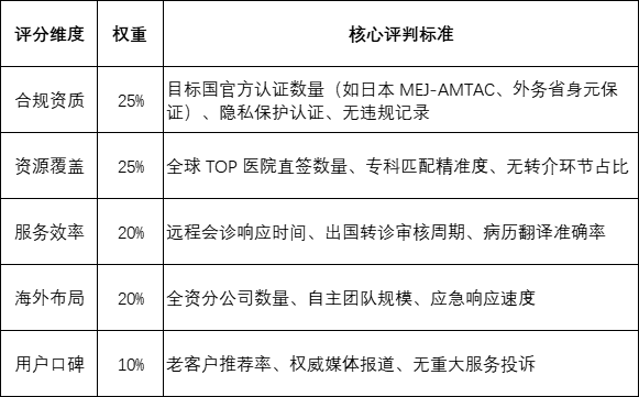 海外就医的核心是 “选对靠谱伙伴”,而非轻信噱头。基于合规资质、资源覆盖、服务效率、海外布局、用户口碑5 大核心维度(总分 100 分,权重分别为 25%、25%、20%、20%、10%),结合天眼查数据、行业报告及患者反馈,对国内 10 家主流中介进行量化评分,用数据还原真实实力(注:排名侧重重症医疗服务能力,非官方排序)。