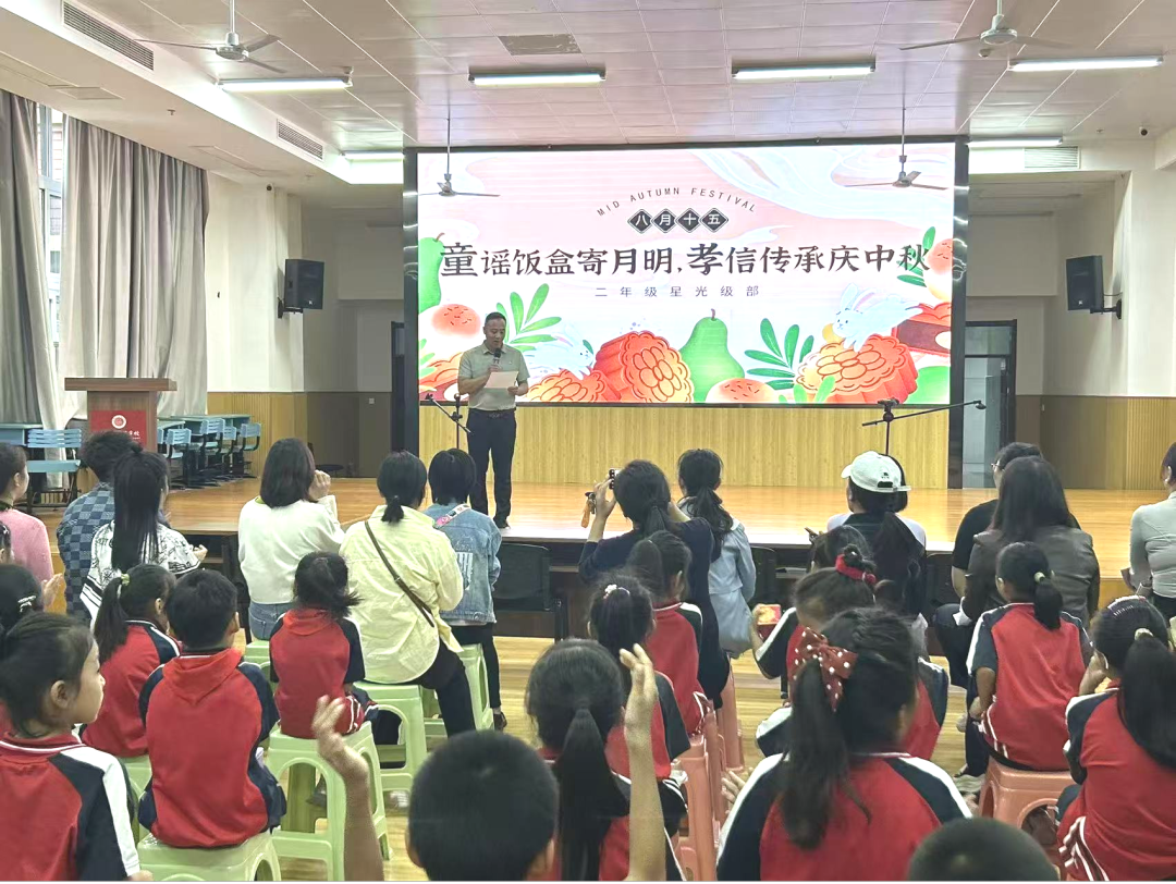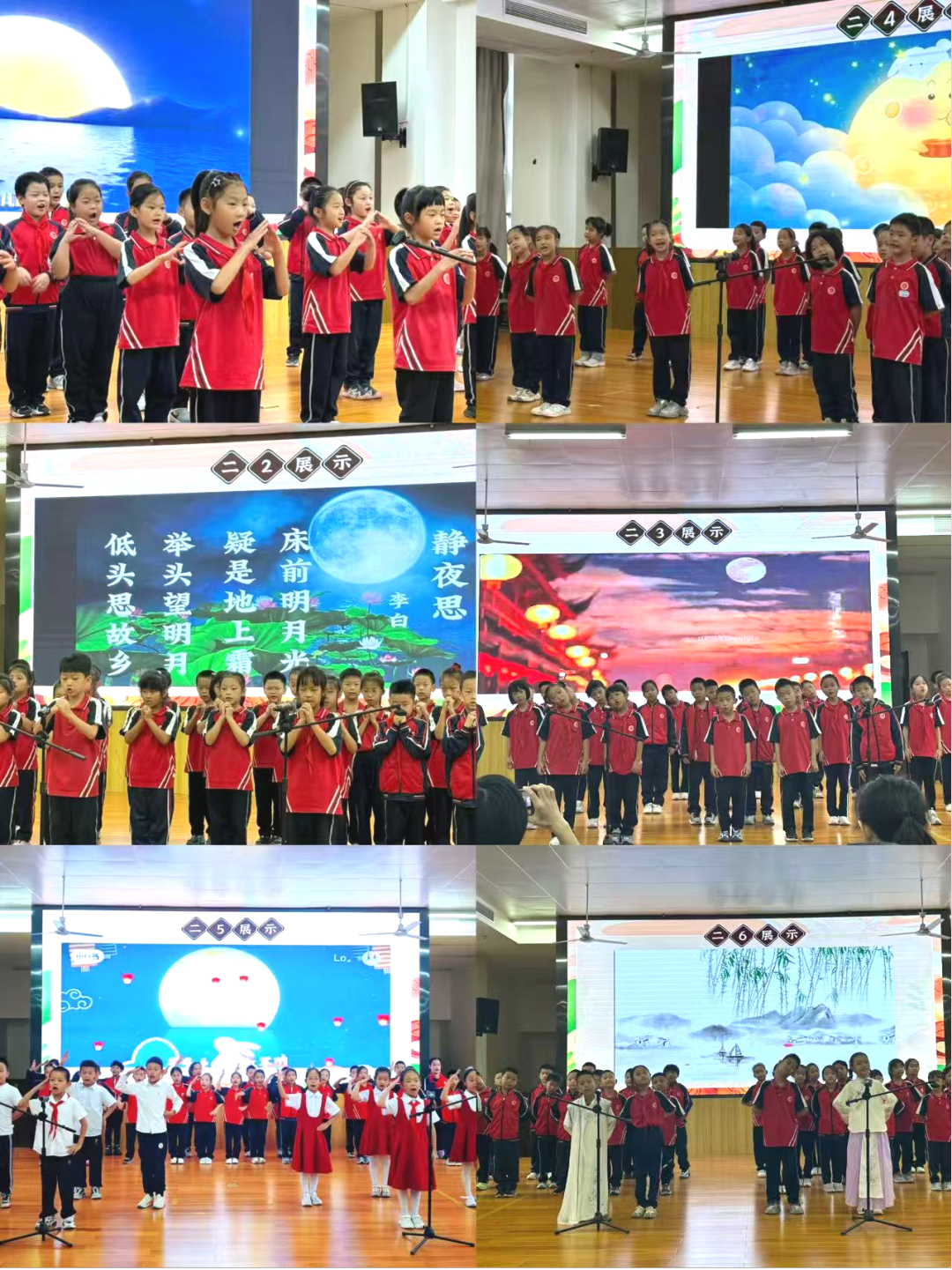 卢宝勇副校长为此次活动致辞,他阐释了中秋文化及“孝”“信”家训的价值,勉励学生积极参与。随着大屏“圆月升空”动画播放,全体师生齐唱《明月几时有》,活动正式开启。