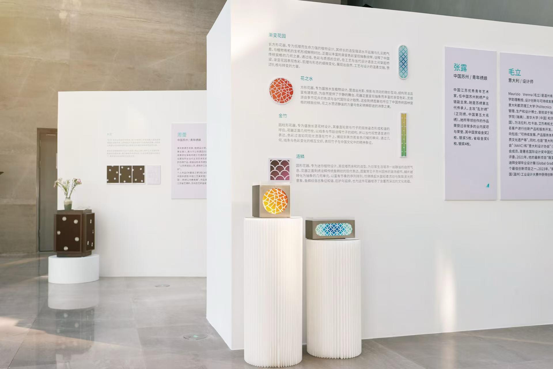 展览以“传统工艺的当代叙事”为空间设计逻辑,划分前言墙、文创展示墙、艺术家简介区及大幅刺绣展品陈列区,细腻呈现绣品的肌理与设计巧思。参展创作者涵盖苏绣新生代与国际设计代表,多元视角共同探索苏绣的当代可能性,让公众近距离感受非遗与生活的融合之美。