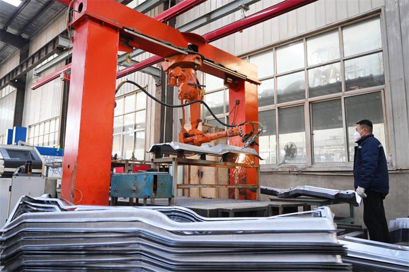 12月8日,在霸州市明月汽车配件厂,全自动激光切割机器人正加工汽车零部件。