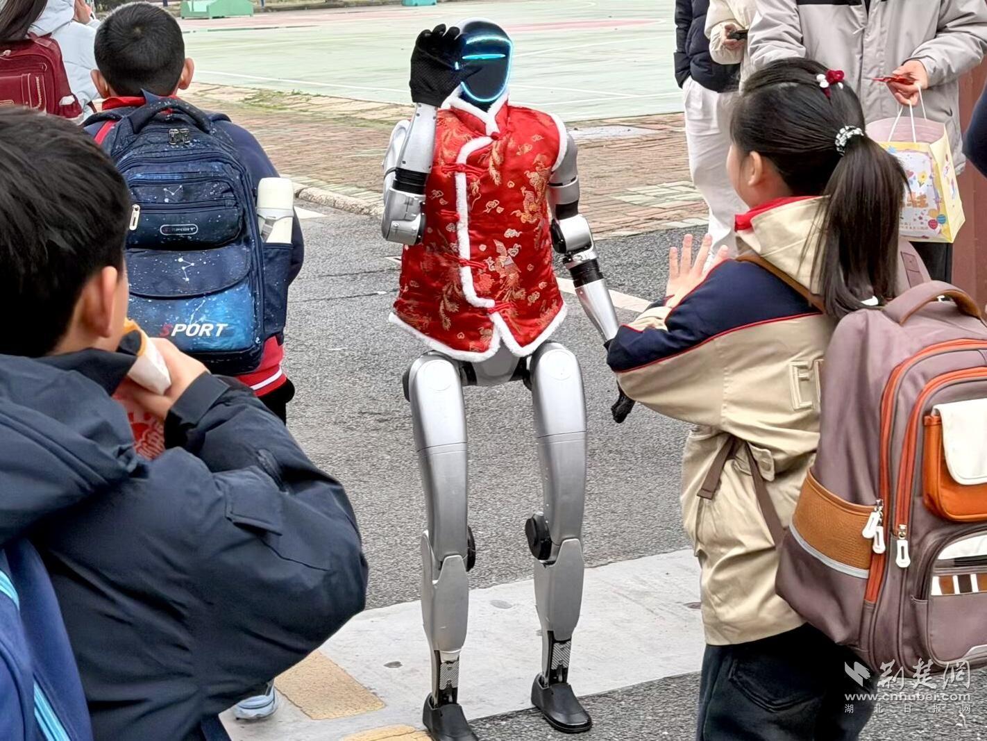 “科技润童心,善养启新程”,清晨的校门口暖意涌动,两位智能机器人“迎新大使”率先登场,伴着欢快旋律挥手、跳舞,全程参与升旗仪式,还在互动环节机智应答,AI科技与纯真童心碰撞,引得孩子们阵阵欢笑。