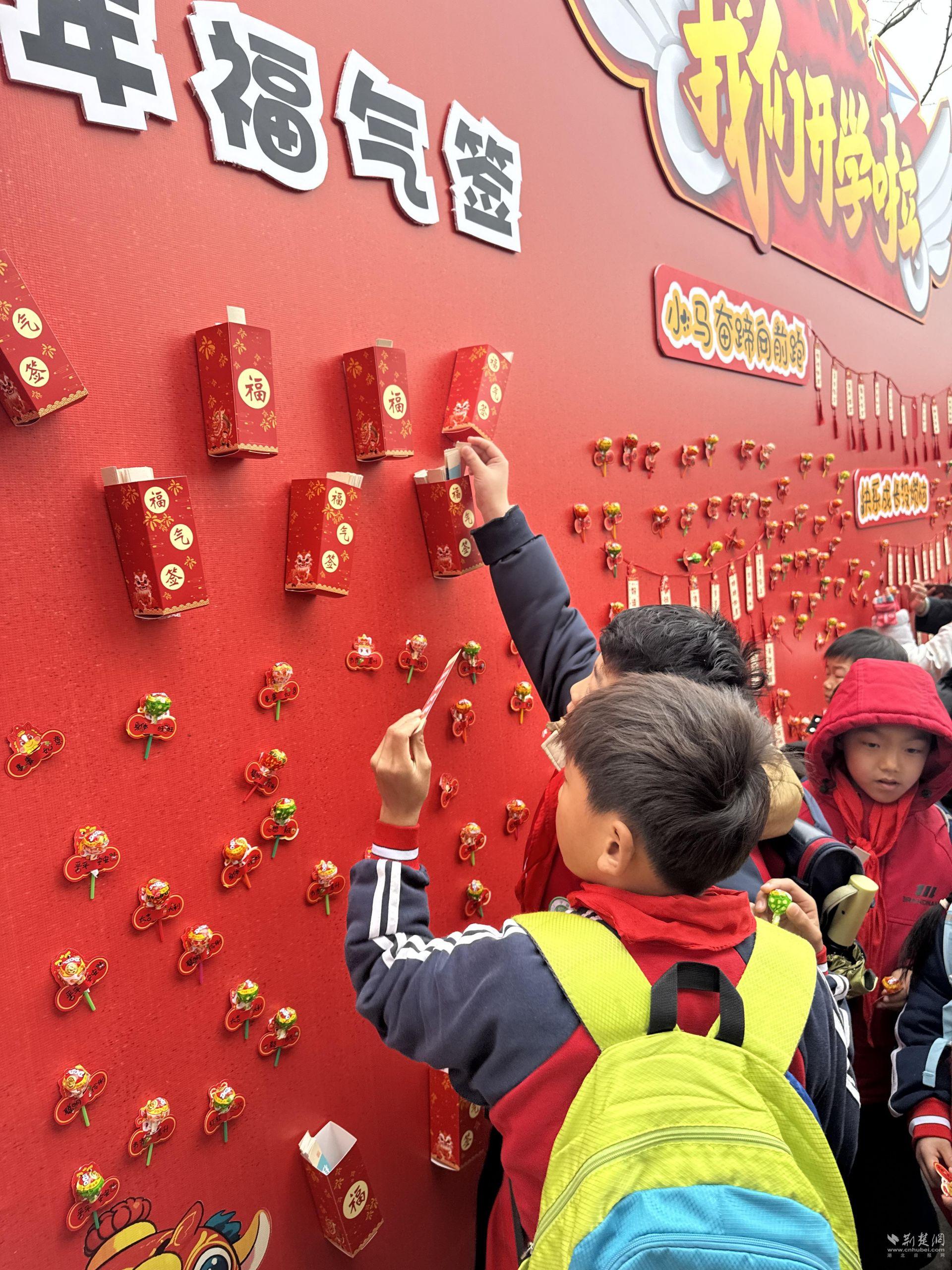 校园内,“我们开学啦”主题打卡点人气高涨,同学们纷纷驻足,抽取专属自己的新学期福气签,领取寓意甜蜜的棒棒糖,小小福签承载着校园的暖心祝愿,丝丝甜意寄托着对学业进步、快乐成长的美好期盼。仪式感满满的迎新环节中,同学们依次跨越印满祝福的彩色跨栏,以昂扬姿态告别过往、迎接新程;随后拿起纸笔,认真写下成长寄语与奋斗目标,郑重粘贴在“心愿成马,奔腾而来”主题背景栏上,在实践中锻炼勇气、锚定方向,让龙马精神浸润童心。