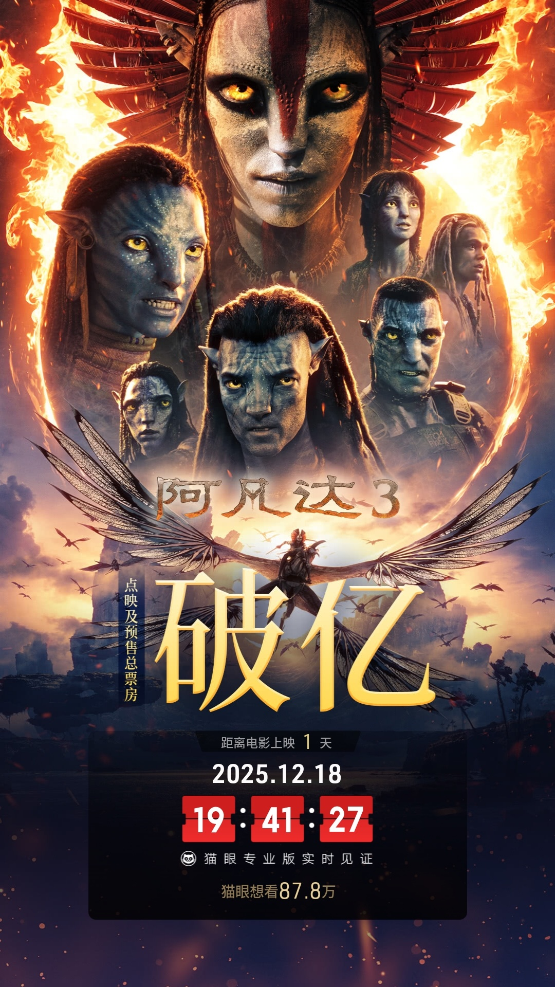 大皖新闻讯 詹姆斯·卡梅隆导演的《阿凡达:火与烬》19日将全面上映,根据猫眼电影专业版数据,截至18日晚7时41分,该片在中国内地市场点映和预售成绩破亿。17日和18日,《阿凡达:火与...