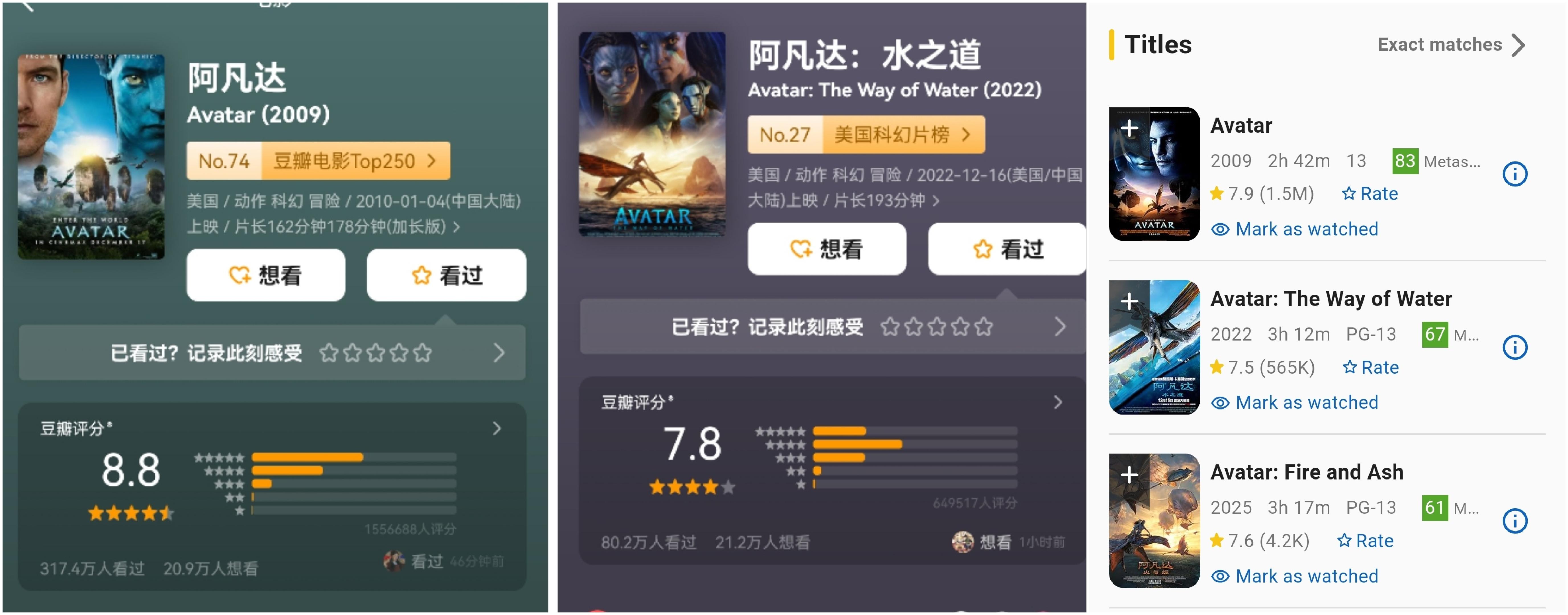 无论北美票房还是同步公映的中国内地市场票房,首周末票房和口碑的表现对于这部续集巨制意义重大。目前全球影史票房排名前三名中,《阿凡达》和《阿凡达:水之道》分列冠军和季军的位置,但是普遍的对于影片的焦虑是《阿凡达:水之道》相较《阿凡达》在口碑和票房上的明显下滑。两部作品6亿美元的全球票房落差显而易见,IMDb评分从7.9下降到7.5,在正式公映前一天,IMDb上已经有4000多人给影片打出7.6的评分;而在豆瓣上,第二部的7.8分比第一部的8.8分下降了整整1分。