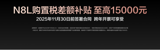 为回馈广大用户的支持与信赖,腾势N8L特别推出限时购车权益,权益价值至高10.67万元!包括价值1.7万元的三年免息,最高1万元的置换补贴。此外,不必担心因为交车晚,享受不到购置税补贴:在2025年11月30日24点前完成合同签署的用户,如果因非用户原因车辆未及时交付,导致开票实际发生在2026年,可享受购置税差额补贴,最高1.5万元!