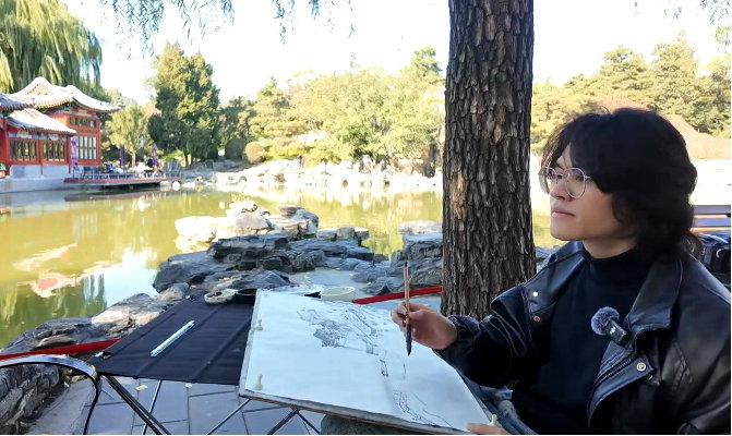 近期,青年画家周书杨携毫墨走进北京日坛,在《书画里的中国》第三季直播间开启沉浸式写生。让日坛的古意与山水的气韵在宣纸上碰撞交融,邀观众共赴一场跨越时空的笔墨之约。