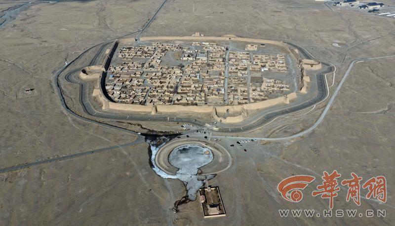 从西安出发七百余公里,视野渐次开阔。冬日戈壁苍茫,枯草覆着薄霜,远处寿鹿山轮廓冷峻。转过一道坡,一座完整的黄土古城豁然入目——这便是永泰古城。空中俯瞰如巨龟伏于戈壁,头尾四足俱全,故得“龟城”之名。部分修复后的古城南门贴上了红红的对联,为苍凉添了几分暖意。