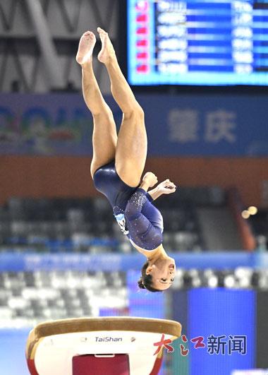 11月16日晚,在广东肇庆新区体育中心体育馆举行的第十五届全国运动会体操女子跳马决赛中,26岁的江西体操名将邓娅兰,以一套无懈可击的动作完美发挥,力压众多年轻选手,成功夺得金牌。全媒体记者 王祺 摄