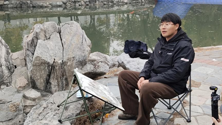 秋日的龙潭湖本就是天然彩墨卷——假山嶙峋、湖水澄澈,元宝枫与银杏褪去葱茏,金黄与绯红的叶片交织出浓淡相宜的色彩。付闻博经实地勘察,将写生点选在游客往来的公园中心区域,这里小桥通幽、假山错落,景致丰富却略显繁杂。他向观众阐释创作理念时坦言,依赖照片创作易丢失现场感受,而写生的价值正在于捕捉石头大小对比、疏密排布的真切质感,提炼感兴趣的元素融入画面,这才是写生的核心意义。