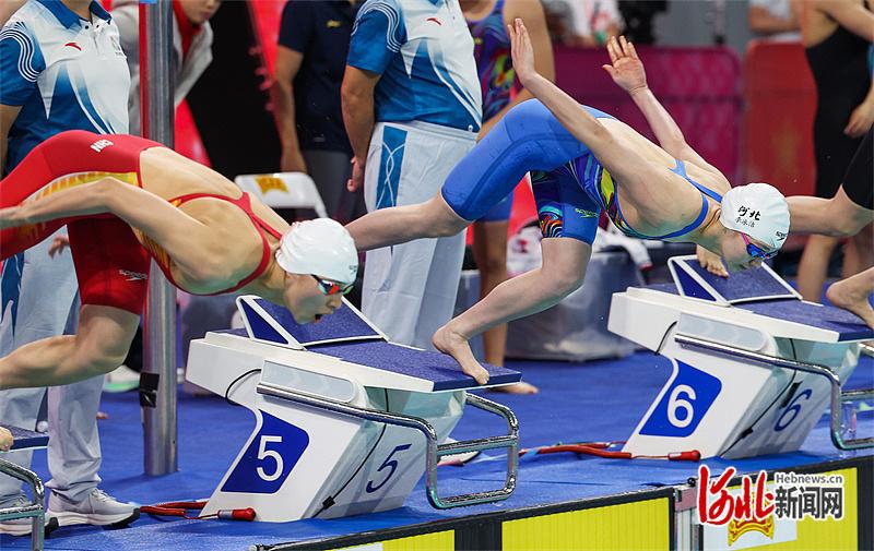 11月10日,河北选手李冰洁(右)在接力赛中。当日,中华人民共和国第十五届运动会游泳比赛在深圳大运中心游泳馆举行。在女子4×100米自由泳接力决赛中,由李冰洁、刘子璇、于子迪、赵静蕾组成的河北队获得铜牌。 河北日报记者 耿辉摄