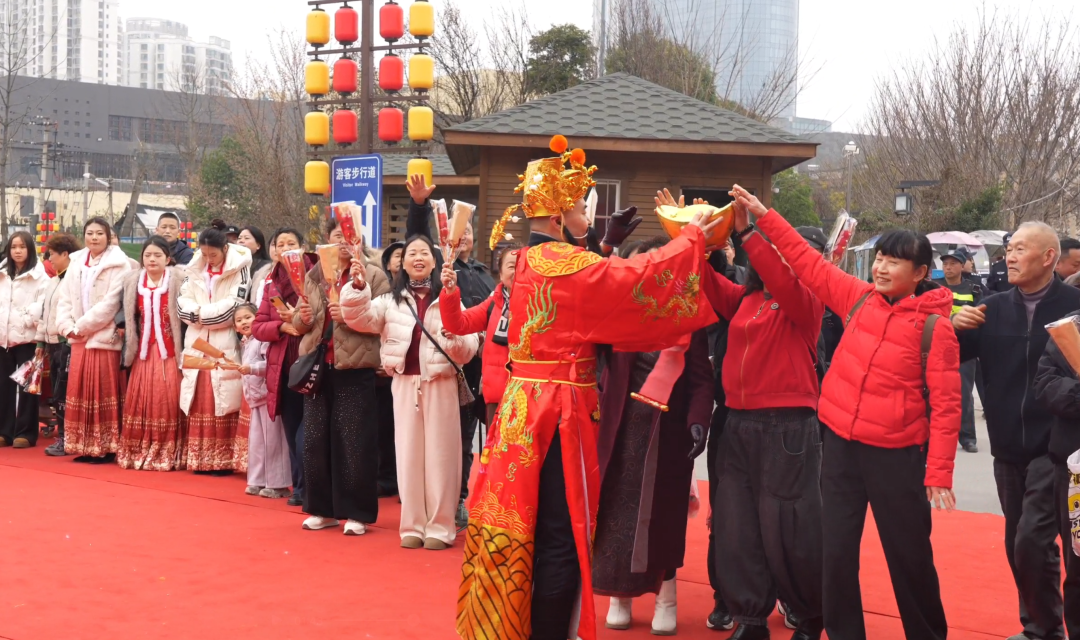 上午9时整,随着暖场背景音乐的循环播放,财神爷携舞蹈演员在古城内互动,工作人员向游客派发抽奖下联纸条,现场气氛迅速升温。财神爷端着奖箱随机抽取幸运游客,首轮100份新年福礼——糖葫芦被一一送出,游客们脸上洋溢着喜悦的笑容。