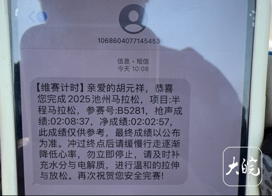 大皖新闻讯 11月16日上午,2025池州马拉松鸣枪开跑后,一道特殊的身影在“最美花海赛道”上格外引人注目——来自池州市东至县胜利镇青云村的37岁的“半马”选手胡元祥,全程手推轮椅完成半程马拉松赛程,最终以2小时02分的成绩冲线,距离他“破2小时”的梦想仅差“两步”之遥。