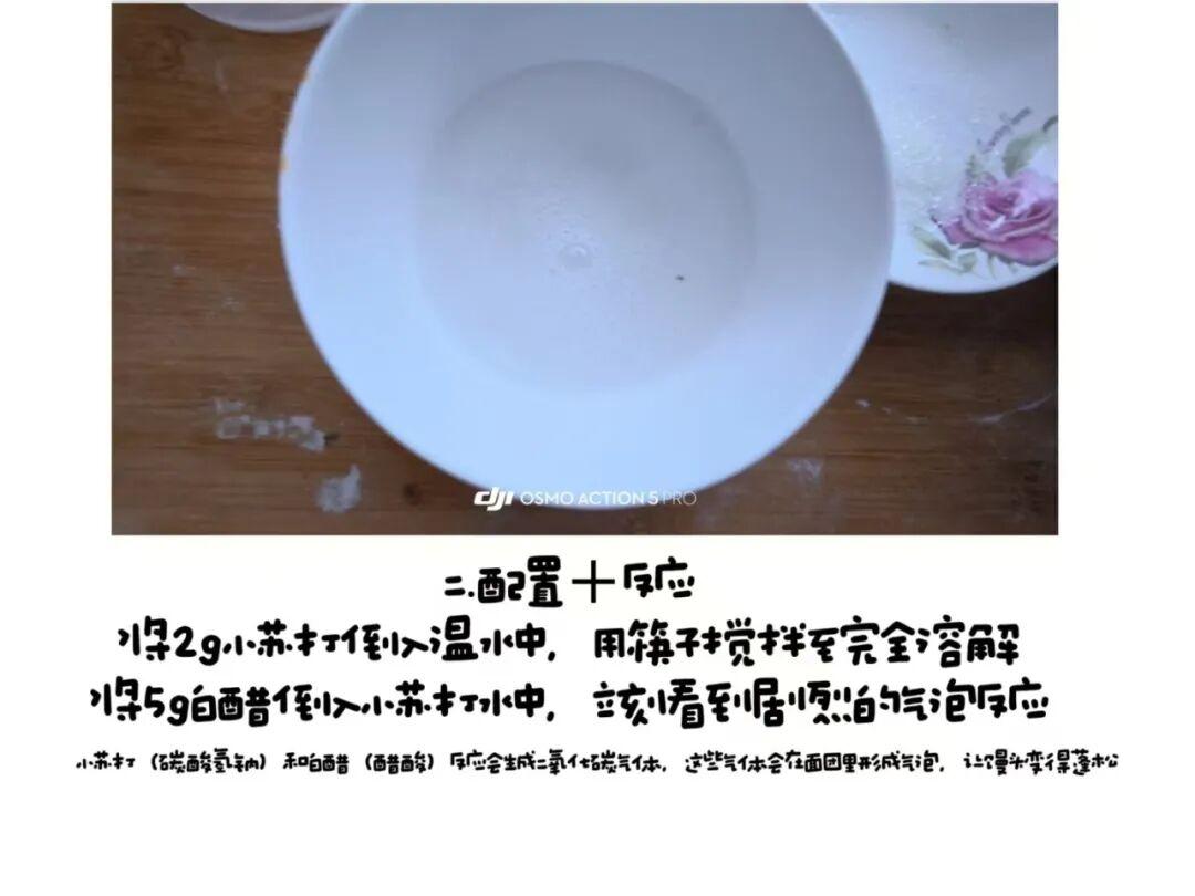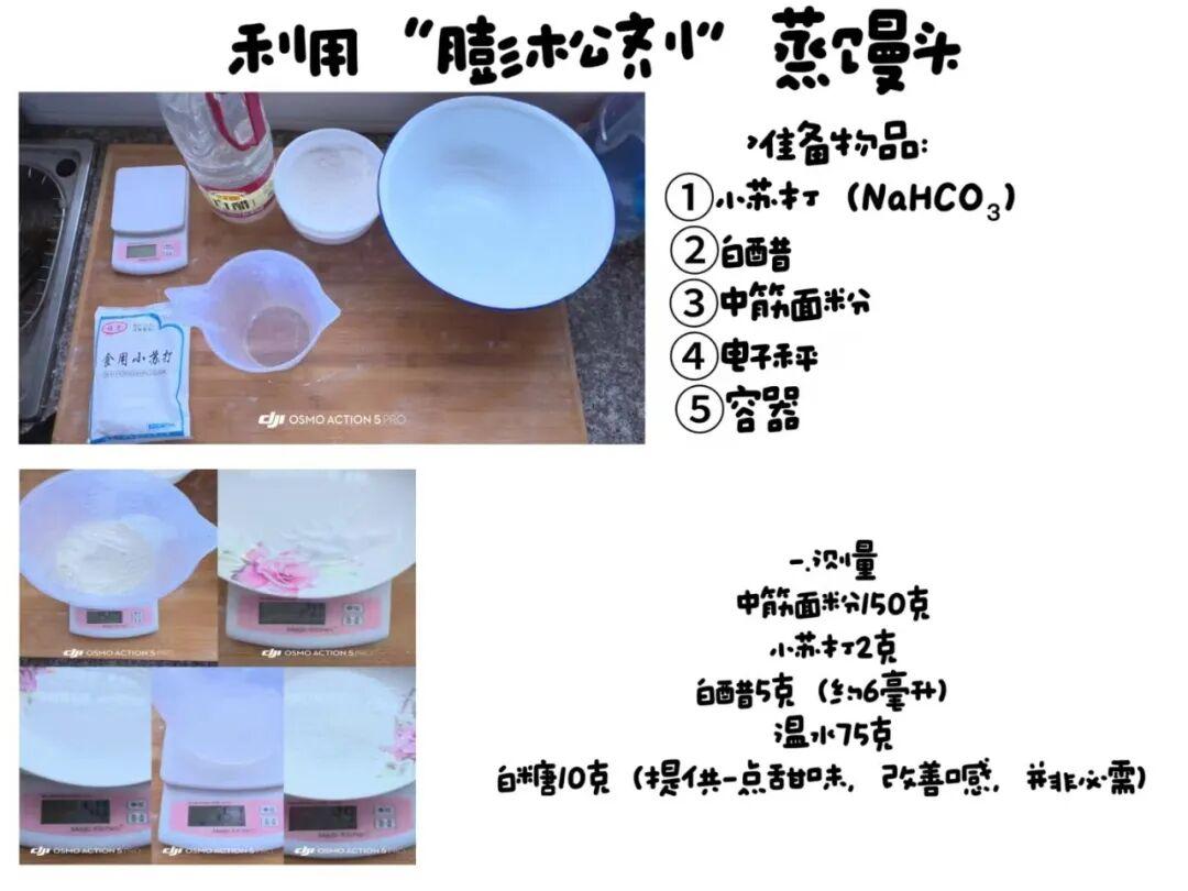 有的同学在餐桌上把白瓷碗一字排开,除了酵母、小苏打还额外准备了“小苏打+食醋”“小苏打+柠檬酸”的组合。从称量食材到揉制面团,从等待发酵到蒸锅冒气,同学们全程亲力亲为。