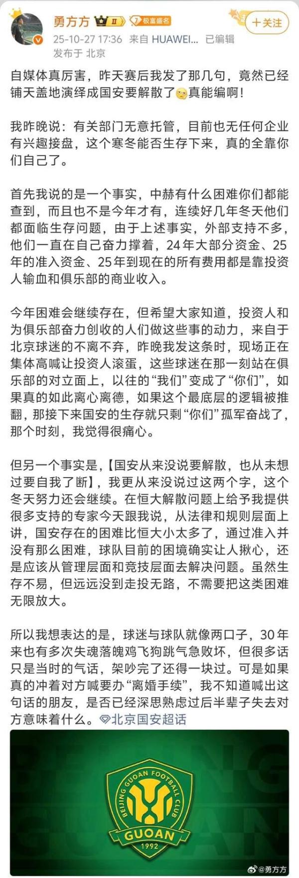 这一切,始于体育博主“勇方方”关于“有关部门无意托管国安,目前也无任何企业有兴趣接盘”的发言被自媒体断章取义……