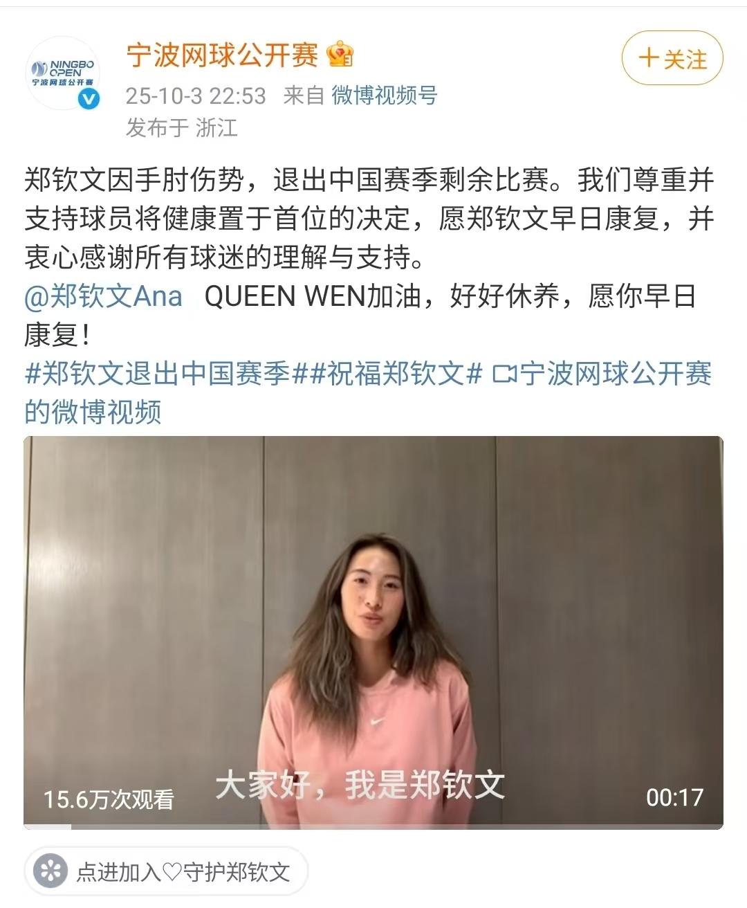 宁波网球公开赛官方回应称,郑钦文因手肘伤势,退出中国赛季剩余比赛。“我们尊重并支持球员将健康置于首位的决定,愿郑钦文早日康复,并衷心感谢所有球迷的理解与支持。郑钦文加油,好好休养,愿你早日康复!”