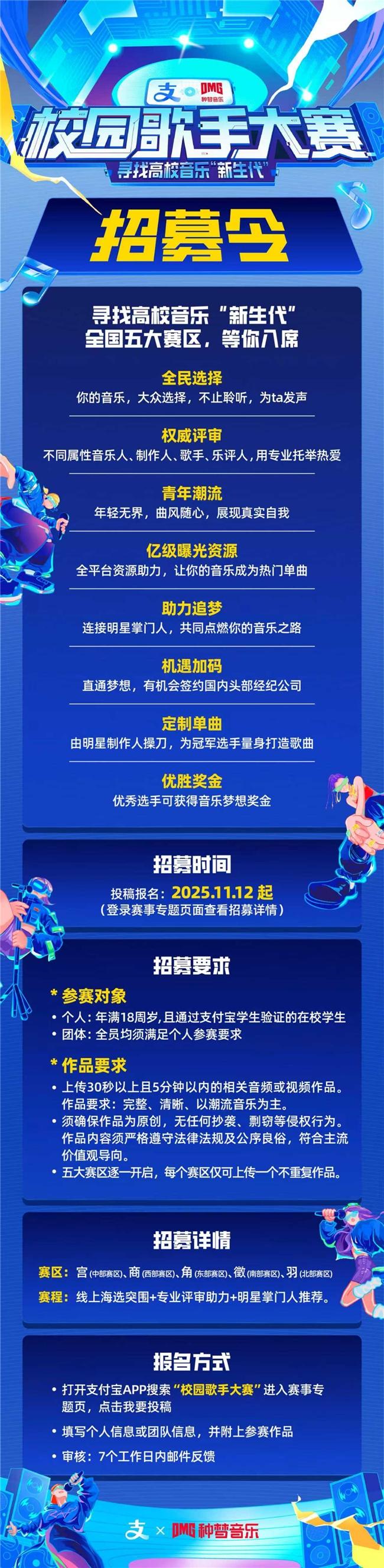 11月12日,由支付宝联合中国顶尖说唱公司种梦音乐D.M.G联合发起的“校园歌手大赛”正式启动,并发布官宣海报招募令。一场校园共振的潮流音乐派对,一次集结全国高校花火的绽放之旅,寻找高校音乐“新生代”,全国五大赛区,等待你的加入,梦想即刻启程!
