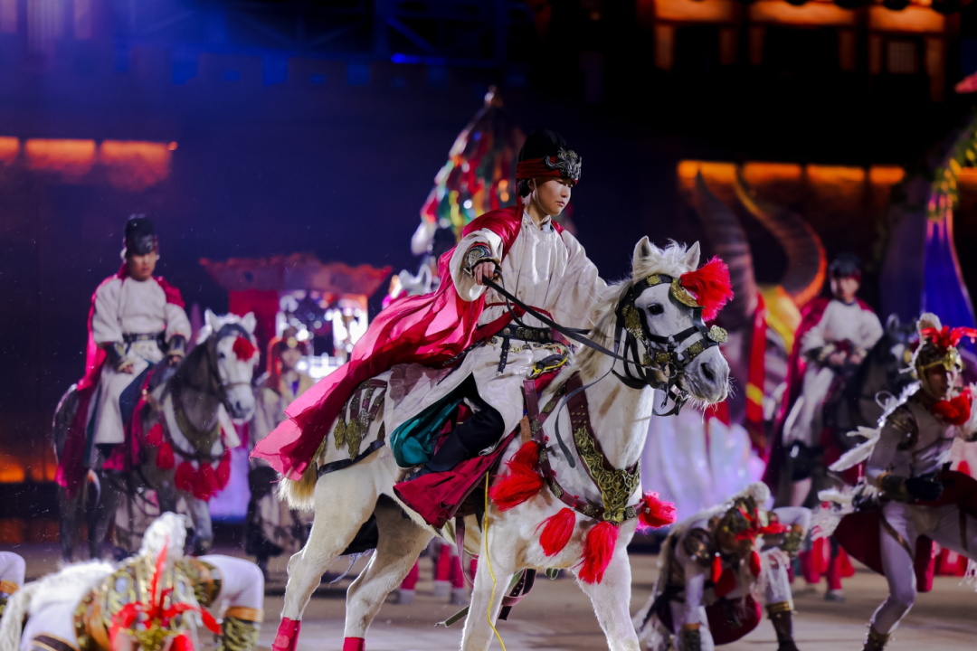 琅琊古城重磅推出的大型实景跨界马秀《国士·捍山河》在马年大年初一正式开演。全剧共四幕,围绕唐代琅琊颜氏兄弟的故事展开,以马战为载体,对琅琊忠勇精神与家国情怀进行了具象化表达为呈现好的表演效果,该剧目汇聚150余名演职人员,上百匹马、骆驼、鹰、狼犬、渡鸦等动物同台献艺,配备400余套高科技舞台设备。