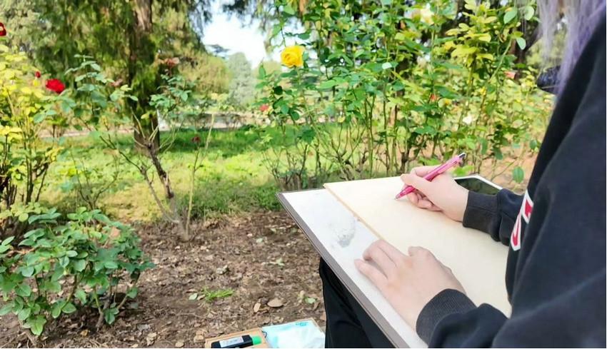 直播镜头以沉浸式的视角,完整记录了张晓瑜创作月季白描的全过程。她首先执起铅笔,进入中国画创作中至关重要的“观物取象”阶段。在天坛斑驳的秋光里,她凝神观察月季的生长态势,在纸面勾勒出月季的铅笔初稿,为后续的笔墨勾勒奠定了坚实基础。随后,她进入白描勾勒阶段,从主体花朵到旁侧枝叶,墨线在她手中流转交织,一簇清雅脱俗的天坛月季渐渐在宣纸上苏醒。她巧妙运用线条的粗细、轻重变化,仅凭墨色就表现出花瓣的柔嫩、叶片的舒展和枝干的劲挺。在最后的阶段,对画面进行调整,使作品更加完善。