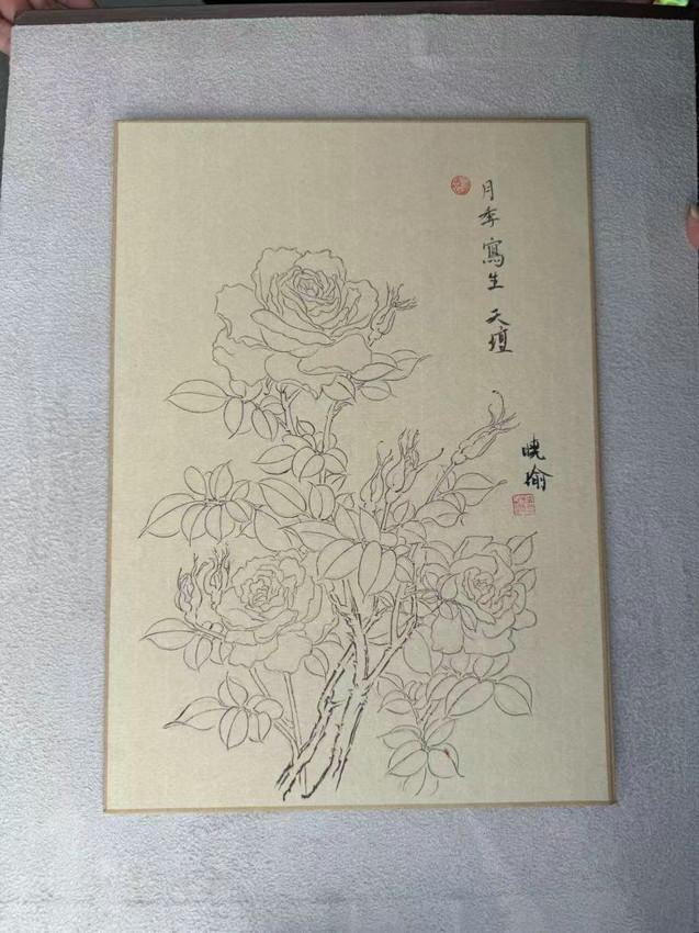 整幅作品墨线干净利落,既有工笔的严谨法度,又不失写意的生动气韵。那些看似简单的线条,实则通过线条的巧妙排布,精准传导出花卉不同部位的形态特质,其柔韧、舒展与刚健,无不被拿捏得恰到好处。这株天坛的月季,就这样在笔与墨的交织中,从转瞬即逝的秋日芳华,化作了纸上的定格。