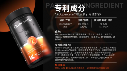 核心技术1:CRISPR-Cas9基因编程技术——通过基因编辑技术对十种天然成分进行优化,提取出高纯度KONlungs十效润肺分子,仅KOUND公司拥有该技术发明专利;