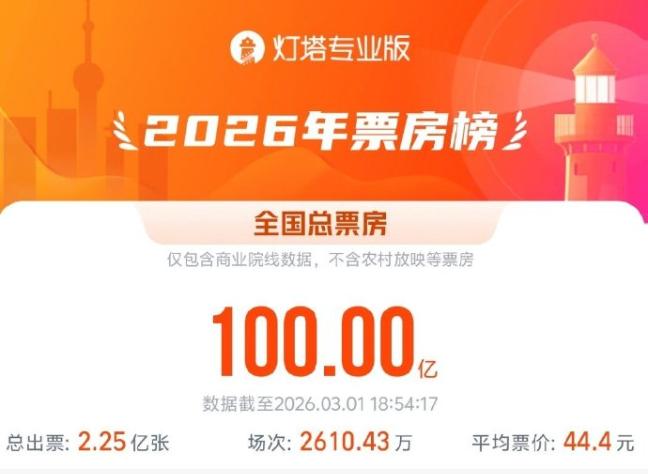据灯塔专业版数据,截至3月1日18点54分,2026年年度电影总票房(含预售)突破100亿元,暂列全球单一市场票房第一。