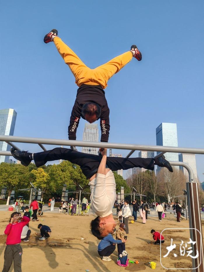 下午,张宏伟来到了天鹅湖市民健身广场。当天的合肥阳光灿烂、气温宜人。张宏伟和以前的玩伴阮贞安、张强三人联袂在双杠上摆了一个造型,引起了围观,“哇!这么厉害!”不时有市民感慨。