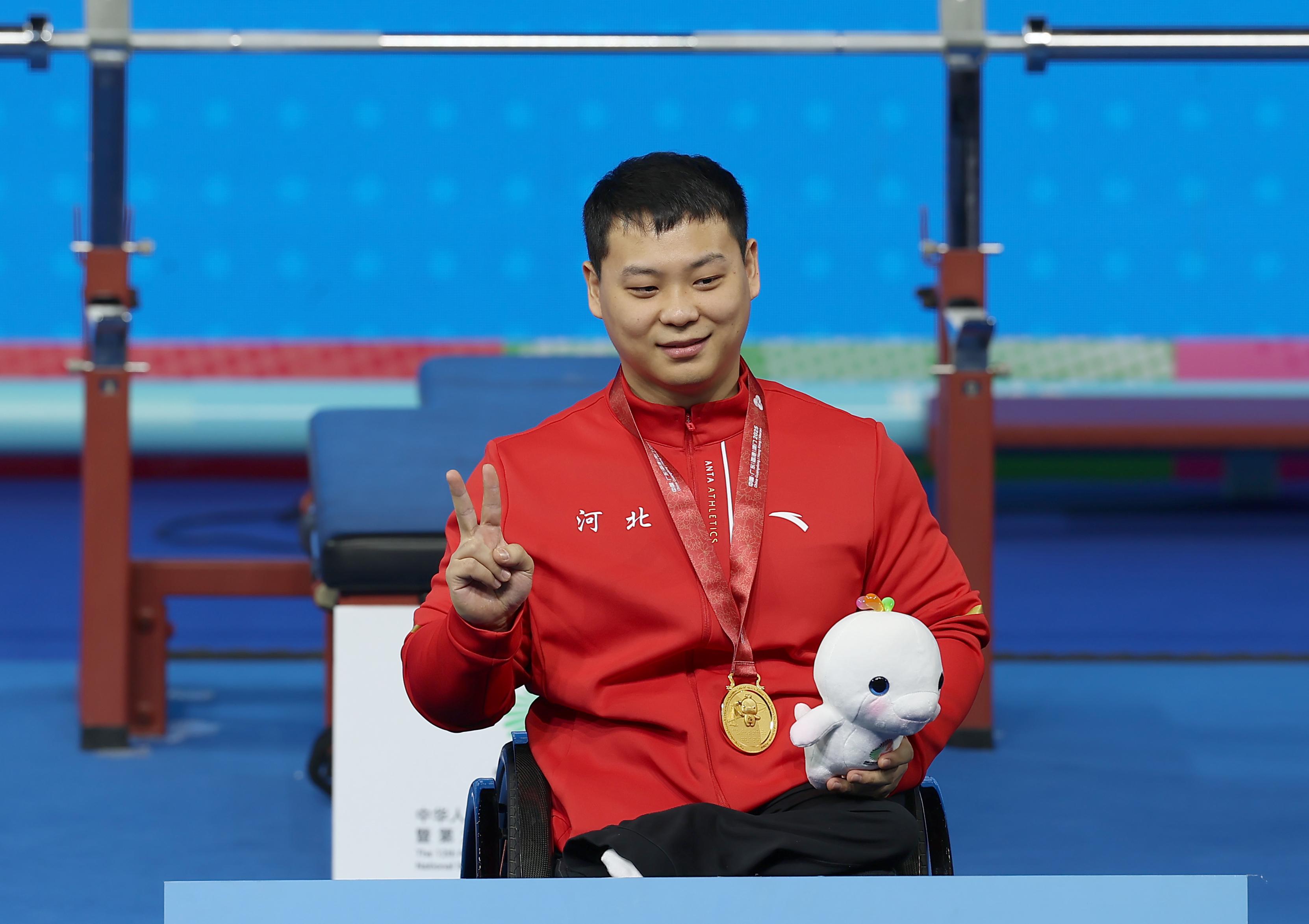 齐勇凯先天腿部残疾,14岁开始练习举重,曾在东京残奥会、巴黎残奥会、2021年残疾人举重世界杯、2023年残疾人举重世锦赛、杭州亚残运会等比赛中夺冠。如今,27岁的他第四次参加全国残运会,实现了在举重男子59公斤级项目上的三连冠。