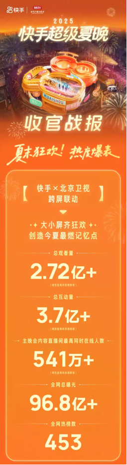 整场晚会以“亲密关系”为主题,通过“看见我们、拥抱我们、成为我们”三大篇章层层递进,恰恰对应了亲密关系形成的心理路径:从身份认同到情感共鸣,最终达成关系升华。通过快手超级夏晚,老铁们实现了从屏幕前的点赞之交到现实中构建深厚情感联结的升华,也引发了年轻人的广泛讨论与参与。据官方数据显示,本次快手超级夏晚直播主晚会内容总观看量突破2.72亿,总互动量超3.7亿次,主晚会内容直播间最高同时在线人数达541万。