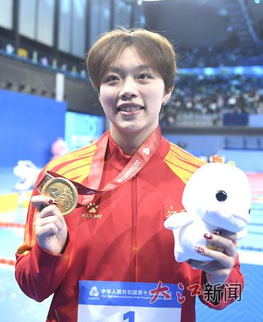 在11月14日晚结束的第十五届全运会女子50米仰泳决赛中,江西名将万乐天如同离弦之箭,以绝对优势率先触壁,以27秒38的优异成绩摘得金牌。 全媒体记者 王祺 摄