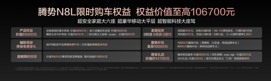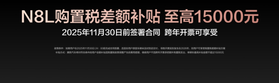 为回馈广大用户的支持与信赖,腾势N8L特别推出限时购车权益,权益价值至高10.67万元!包括价值1.7万元的三年免息,最高1万元的置换补贴。此外,不必担心因为交车晚,享受不到购置税补贴:在2025年11月30日24点前完成合同签署的用户,如果因非用户原因车辆未及时交付,导致开票实际发生在2026年,可享受购置税差额补贴,最高1.5万元!