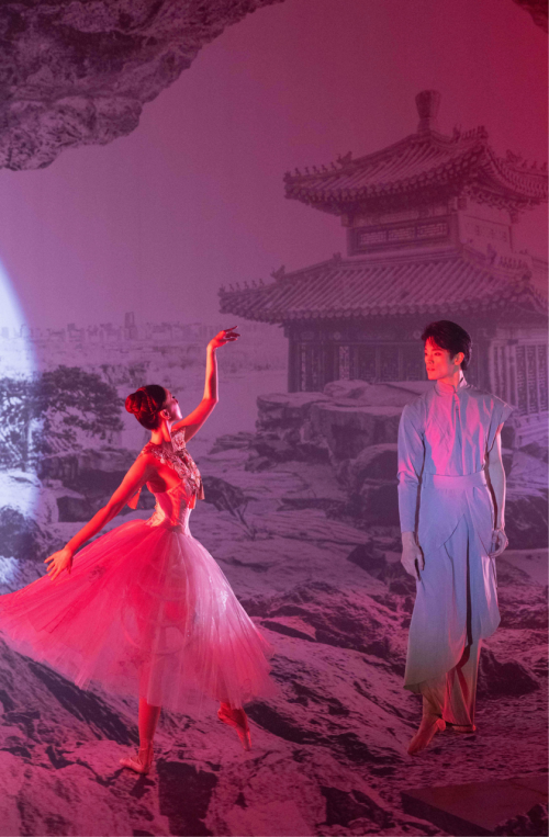 此次个展开幕特别邀请著名芭蕾舞蹈家邱思婷作为开幕表演嘉宾,在他的巨幅作品《通往颐和园之径》前为观众带来了一场如梦似幻的艺术现场,邱思婷不仅以其精湛的艺术表现力呈现了穿越东西方文化的艺术对话,更以编舞的智慧,将芭蕾、昆曲、武术、剑舞巧妙融汇,舞者毛长俊、吴俊霄、昆曲小生李豪穿梭在岩石与颐和园的景象之中,每一个手势、步伐都在拉威尔《波莱罗》音乐层层递进的旋律下述说着文化的诗篇。邱思婷时而脚尖点地,时而腾空而跃,时而伏地起舞,细腻而深刻的表现力感染着在场的每一位观众。《波莱罗》经典的音符仿佛长在了她的指尖与足尖,她用“镜中花,水中月”的理念呼应了JR作品中表达的“你看见的就是真实的吗?”。