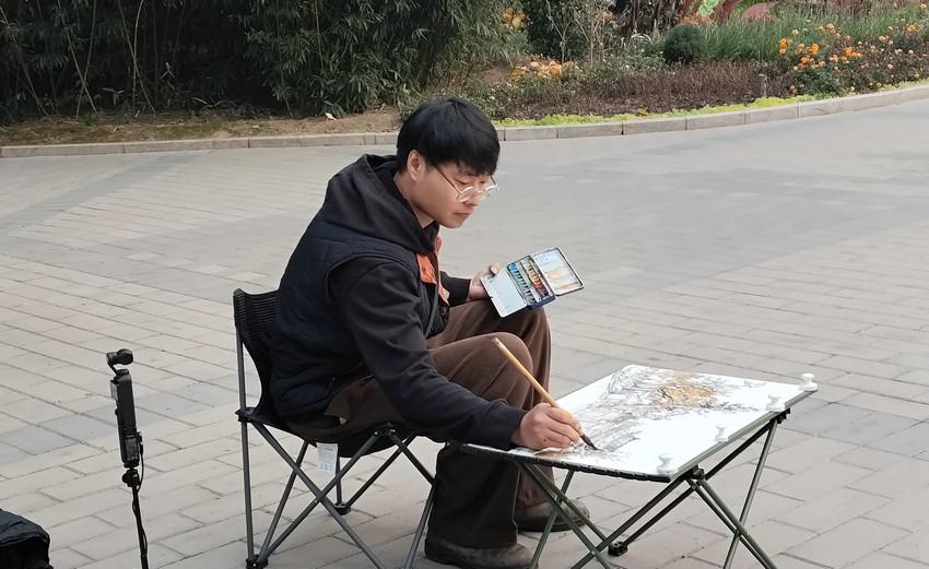 付闻博选定了龙潭公园西北门位置,这里有好看的仿古建筑,还有几棵极具秋景代表性的树木。在完全确定构图前,他先用淡墨勾勒出主要结构,做到心中有数。随着笔尖流转,一幅秋日龙潭图渐次成型:画面右侧,青瓦翘檐的仿古建筑错落排布,灰白的墙体衬着雕花门窗,飞檐的线条舒展灵动,尽显古建的雅致韵味;左侧几株树木占据了大半画面,浓墨勾勒的枝干苍劲舒展,叶片晕染出金黄、橙红的暖色调,秋意浓烈又鲜活。前景是简洁的石砌路面与低矮围栏,笔触写意松弛,将现场景致的核心魅力精准呈现。