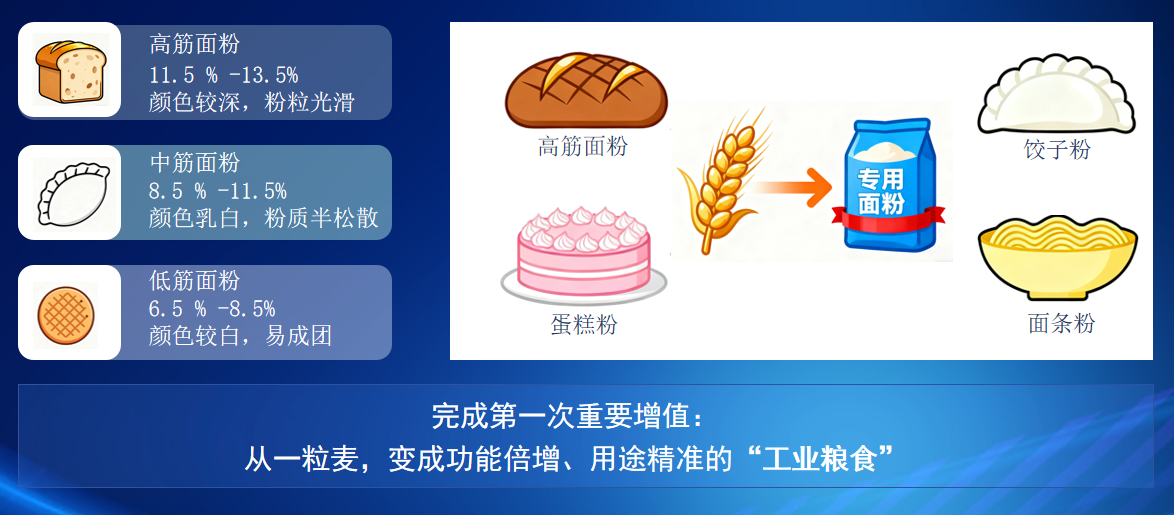 真正的“增值魔法”,始于小麦进入工厂的那一刻。刘昆仑介绍,现代制粉早已告别“石磨碾碎”的传统模式,升级为“数字化、智能化、绿色化”的精准作业。小麦先经振动筛、色选机等设备“体检”,剔除杂质与瑕疵粒;再通过精准控湿的润麦环节软化胚乳,为后续加工“铺路”;最终在多道磨粉机、清粉机构成的系统中反复研磨筛理,分离出麸皮、胚芽与胚乳,还能按需生产高筋面包粉、低筋蛋糕粉等专用粉,实现首次身价倍增。